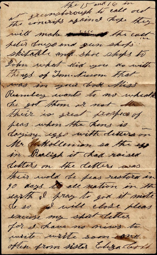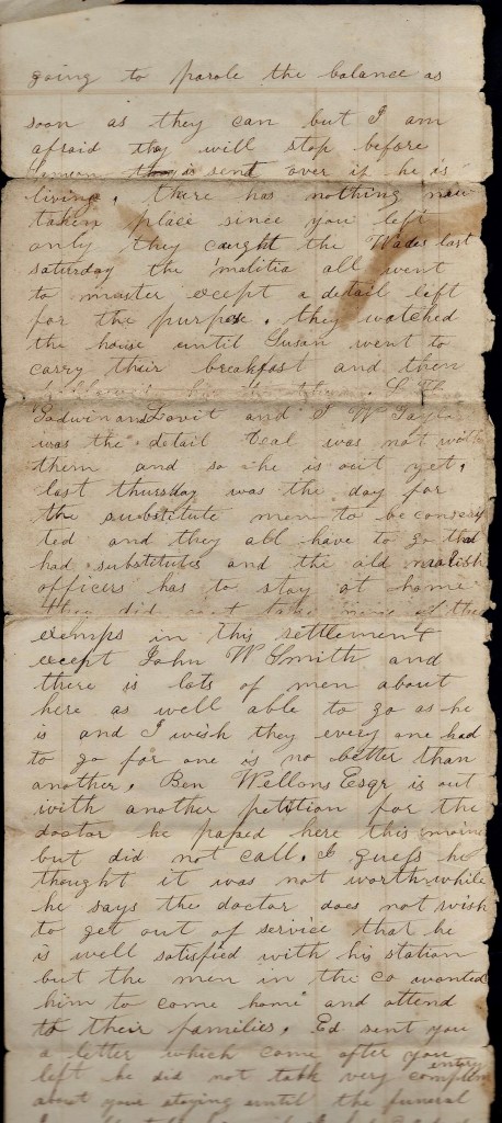 Last Thursday was the day for the substitute men to be conscripted and they all have to go that had substitutes and the old militia officers has to stay at home. They did not take none of the exempts in this settlement except John W. Smith and there is lots of men about here as well able to go as he is and I wish that everyone had to go for one is no better than another.