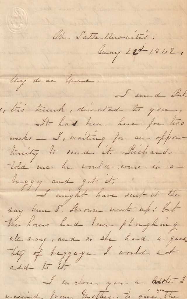 I send Bettie’s trunk, directed to you. It had been here for two weeks, I waiting for an opportunity to send it. Richard told me he would come in a buggy and get it. I might have sent it the day Ann E. Brown went up, but the hours had been ploughing all day, and as she had a quantity of baggage I would not add to it.