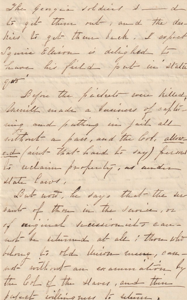 Before the pickets were killed, Merrill made a business of capturing and putting in jail all without a pass, and the Col. allowed (ain’t that hard to say) persons to reclaim property as under State laws. But now, he says that the servants of them in the service, or of original secessionists cannot be returned at all. Those who belong to old Union men cannot without an examination by the Col. of the slaves, and their perfect wilingness to return.