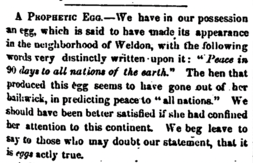 There is great prospect of peace when hens is laying eggs with letters on. Mr. Hollenian saw the egg in Raleigh. It had raised letters on [it]. The letters was there would be peace restored in 90 days to all nation in the earth. I pray to God it might be so.