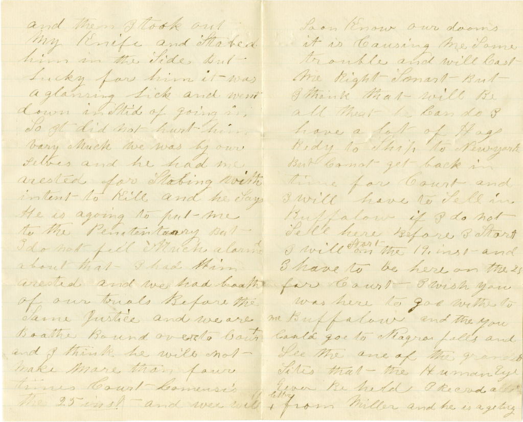 Nothing of interest has transpired from my last but I got into some difficulty with Charley Quinn and he called me a damned abolitionist and struck me two or three times and then I took out my knife and stabbed him in the side. But lucky for him it was a glancing stick and went down instead of going in so I did not hurt him very much. We was by ourselves and he had me arrested for stabbing with intent to kill and he says he is a going to put me to the penitentiary but I do not feel much alarmed about that. I had him arrested and we had both of our trials before the same justice and we are both bound over to court and I think he will not make more than four times. Court commences the 25th inst. and we will soon know our dooms. It is causing me some trouble and will cost me right smart but I think that will be all that he can do.