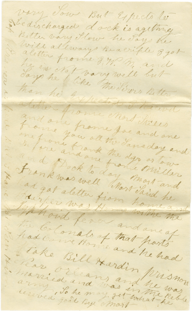 I received a letter from Miller and he is a getting very low but he expects to be discharged. Dock is a getting better very slow. He says he will always be a cripple. I got a letter from J. W. M. and he is not very well but says he likes the service better that he expected. I received a letter from Mort Stiles and one from Joe and one from you all the same day and one from Frank the day or two before and one from Miller and Dock today. Mort and Frank was well. Mort said he had got a letter from home and Harper was home with the typhoid fever and one of the Colonels of that parts had come home and he had took Bill Hardin prisoner near New Orleans and he was married and was in the Rebel army. So he may get what he deserved. Goodbye, — Mort