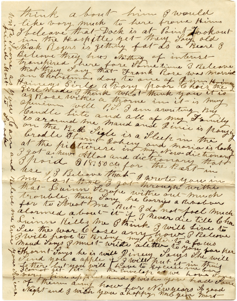 I believe that Doc is at Point Lookout in the hospital yet. They say old Noah Rogers is getting fat as a bear. I believe there has nothing of interest transpired here for some time. I believe that they say that Frank [M.] Rose was married on Christmas day to one of Jim Haney’s girls [Eunice]—a very poor choice the girl made, I think. What think you? It is a rose with a thorn in it is my opinion