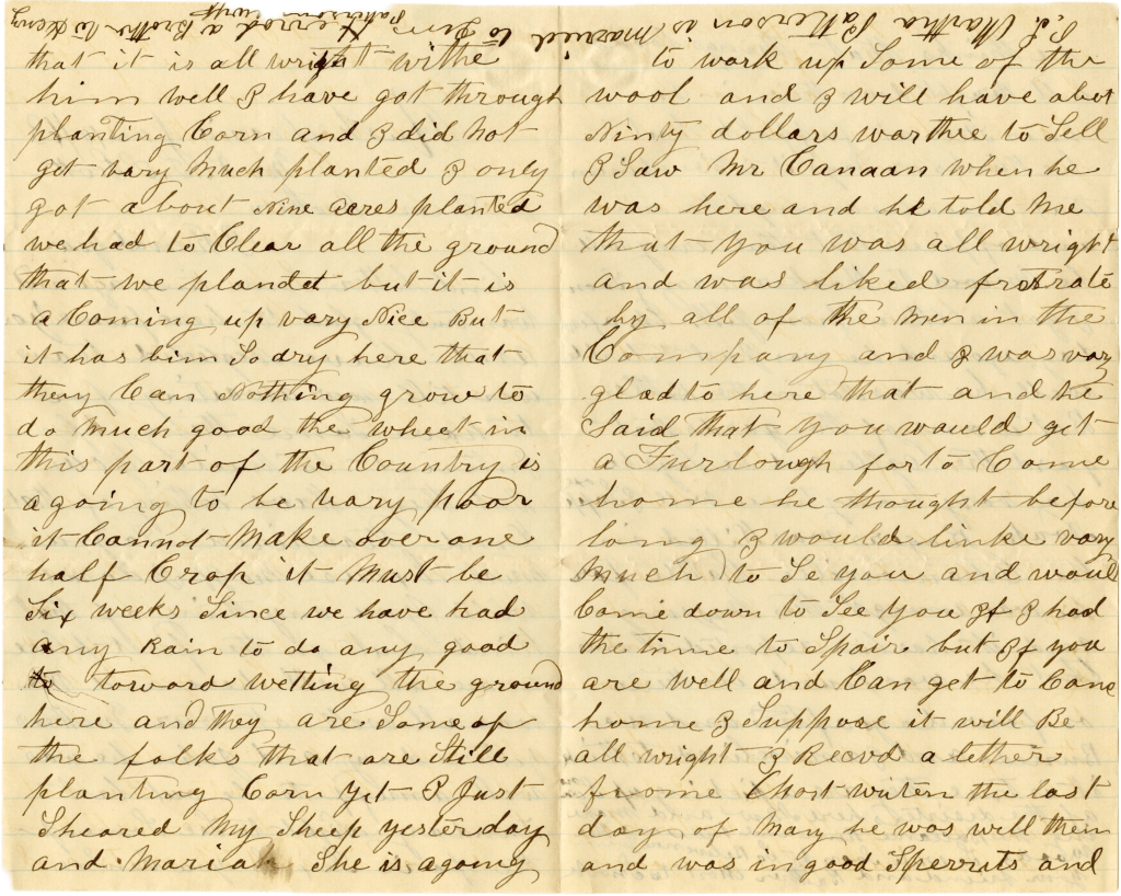 I just sheared my sheep yesterday and Maria, she is a going to work up some of the wool and I will have about ninety dollars worth to sell. I saw Mr. Canaan when he was here and he told me that you was alright and was lied first rate by all of the men in the company and I was very glad to hear that. And he said that you would et a furlough for to come home he thought before long. I would like very much to see you and would come down to see you if I had the time to spare. But if you are well and can get to come home, I suppose it will be alright.