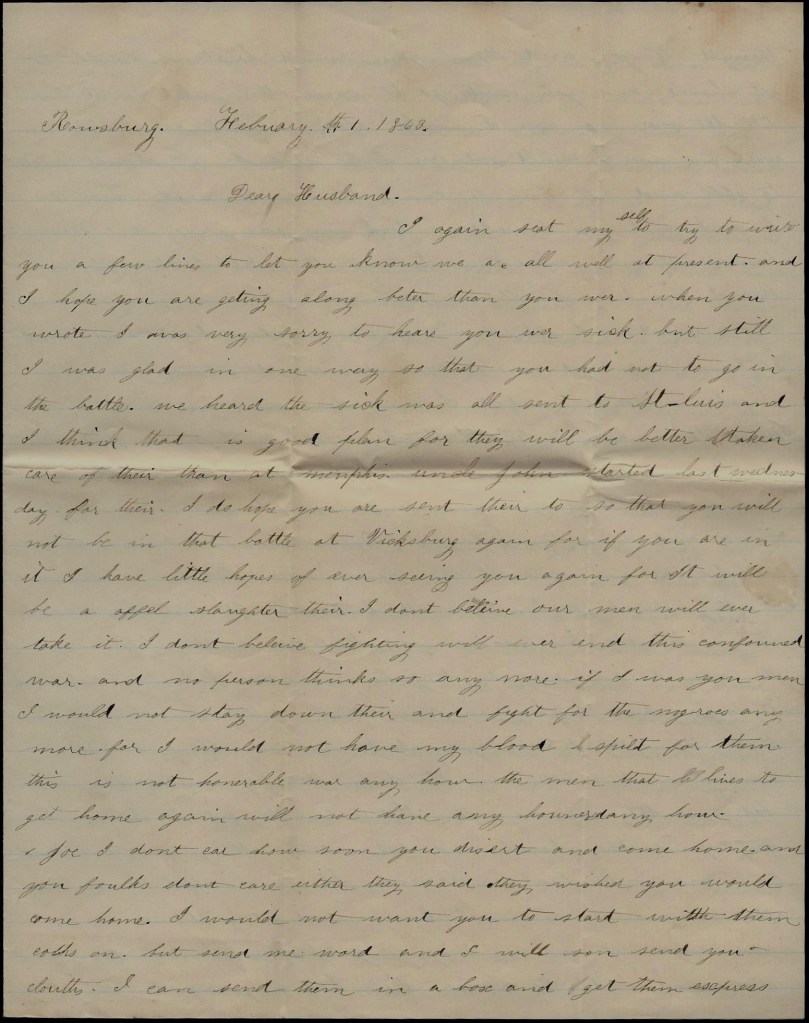 In this letter, Lizzie shares home-front information with her husband including the excitement raised between Union loyalists and secession sympathizers who were derisively called “Butternuts” or “Copperheads.” Her youthful exuberance relating social activity and local courtships is on full display as her husband is about to embark on an expedition down the Mississippi from Memphis to Young’s Point, opposite Vicksburg.
