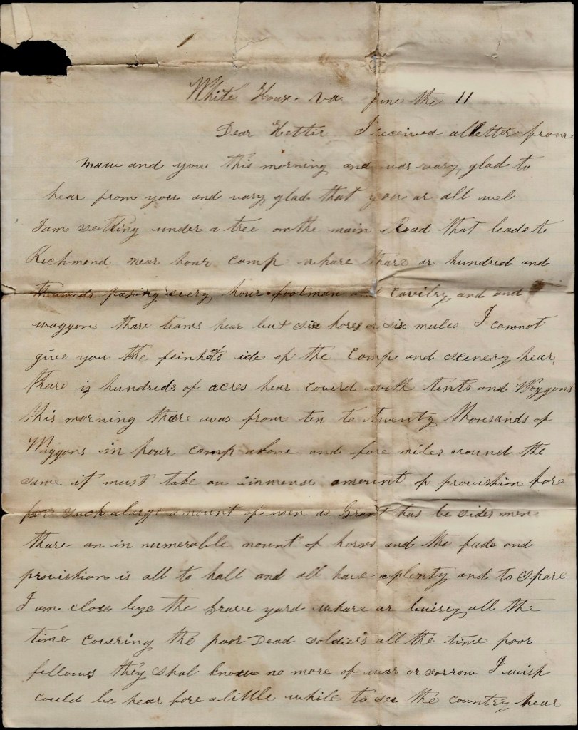 I am sitting under a tree on the main road that leads to Richmond near our camp where there are hundreds and thousands passing every hour—footmen and cavalry and wagons. Their teams here have but six horses or six mules. I cannot give you the faintest idea of the camp and scenery here. There is hundreds of acres here covered with tents and wagons. This morning there was from ten to twenty thousands of wagons in our camp alone and four miles around the same. It must take an immense amount of provision for such a large amount of men as Grant has besides men. There is an enumerable amount of horses and the feed and provision is all to haul and all have a plenty and to spare.