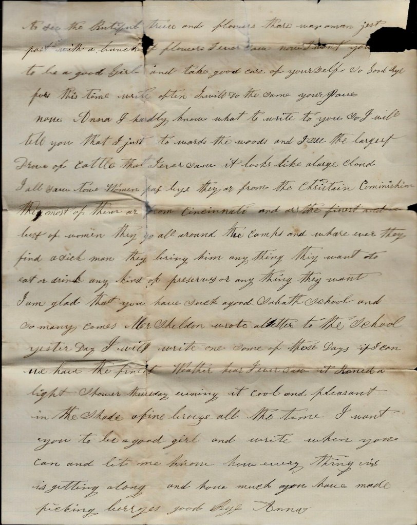 Now Anna, I hardly know what to write to you so I will tell you that I just [looked] towards the woods and I seen the largest drove of cattle that I ever saw. It looks like a large cloud. I also saw two women pass by. They are from the Christian Commission. The most of them are from Cincinnati and are the finest and best of women. They go all around the camps and wherever they find a sick man, they bring him anything they want to eat or drink, any kind of preserves or anything they want.