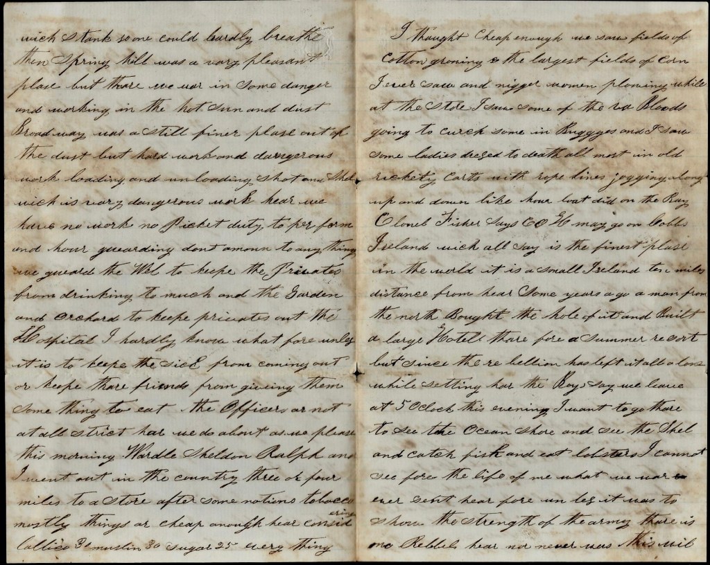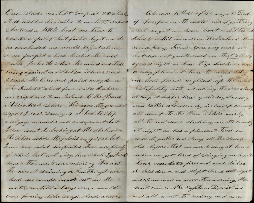 Colonel [Samuel S.] Fisher says Co. H may go on Cobb’s Island which all say is the finest place in the world. It is a small island ten miles distance from here. Some years ago a man from the North bought the whole of it and built a large hotel there for a summer resort. But since the rebellion has left it all a loss.
