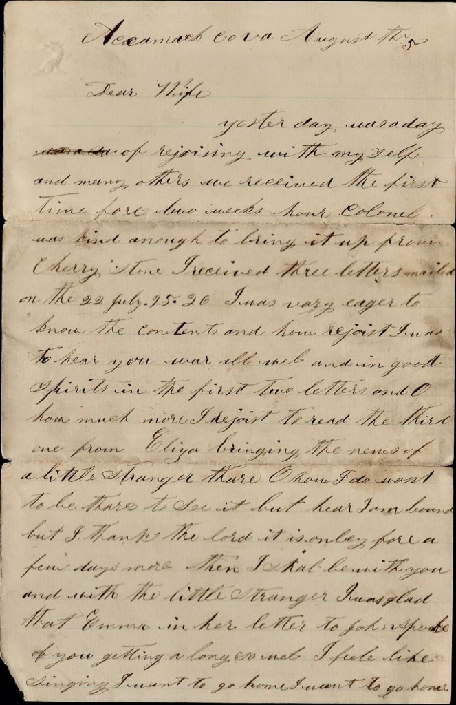 From Sarah’s letters we can gain some small idea of what it was like for the work-a-day lives of the wives and mothers who were left at home while their husbands went off to serve their country. At the time these letters were written in the summer of 1864, Sarah had four children ranging in age from four to fourteen to take care of, an elderly mother, and a large farm to manage. What she does not reveal in her letter—except to hint by writing, “I find it inconvenient these warm days,”—is that she was eight months pregnant at the time carrying her fifth child, Alice Rose (a.k.a., “the little stranger.”)