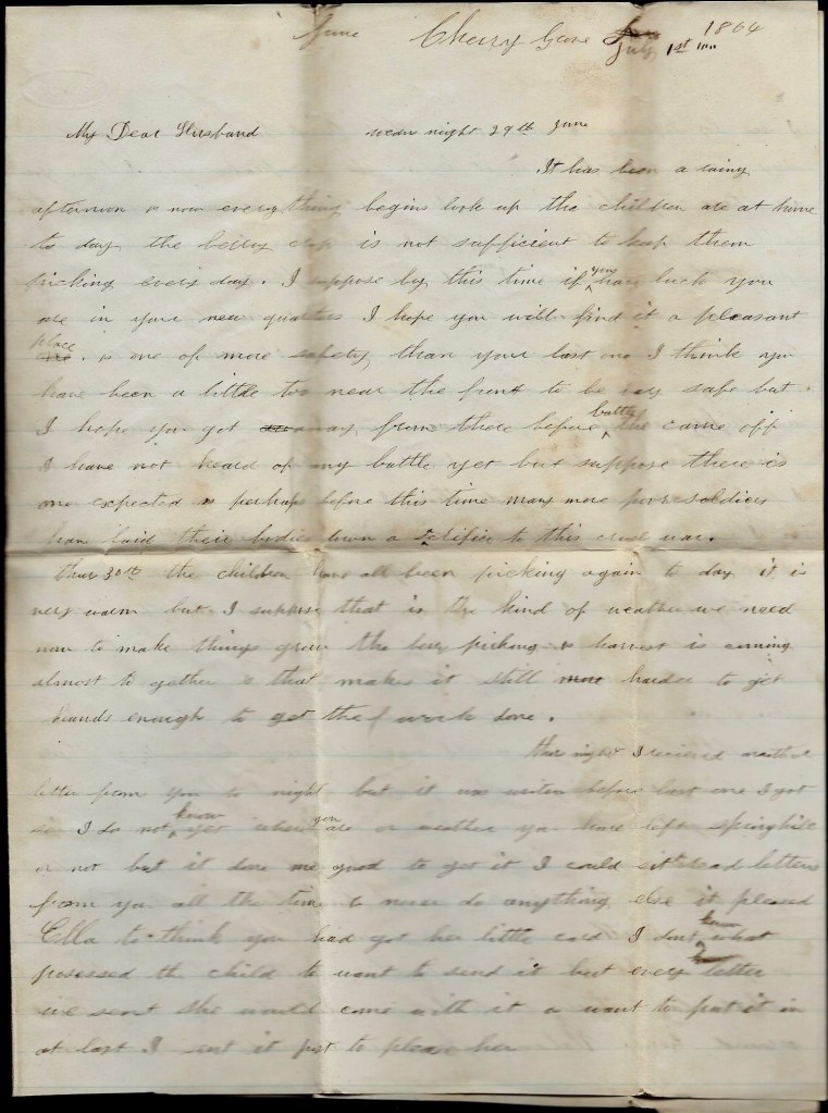 It has been a rainy afternoon and now everything begins to look up. The children are at home today. The berry crop is not sufficient to keep them picking every day. I suppose by this time if you have luck, you are in your new quarters. I hope you will find it a pleasant place and more of more safety that your last one. I think you have been a little too near the front to be very safe but I hope you got away from there before the battle came off. I have not heard of any battle yet but suppose there is one expected & perhaps before this time many more poor soldiers have laid their bodies down a sacrifice to this cruel war.
