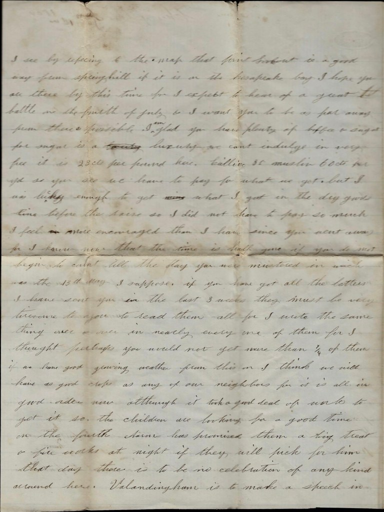 I see by referring to the map that Point Lookout is a good way from Spring Hill. If it is on the Chesapeake Bay, I hope you are there by this time for I expect to hear of a great battle on the Fourth of July & I want you to be as far away from there as possible. I am glad you have plenty of coffee and sugar for sugar is a luxury we can’t indulge in very free. It is 23 cents per pound here. Calico 30, muslin 60 cents per yard. As you see, we have to pay for what we get, but I was lucky enough to get what I got in the dry goods line before the raise so I did not have to pay so much. I feel more encouraged that I have since you went away for I know now that the time is half gone if you do not begin to count till the day you have mentioned in which was the 13th of May. I suppose if you have got all the letters I have sent you in the last three weeks, they must be very tiresome to you to read them all for I write the same thing over and over in nearly every one of them for I thought perhaps you would not get more than a quarter of them.
