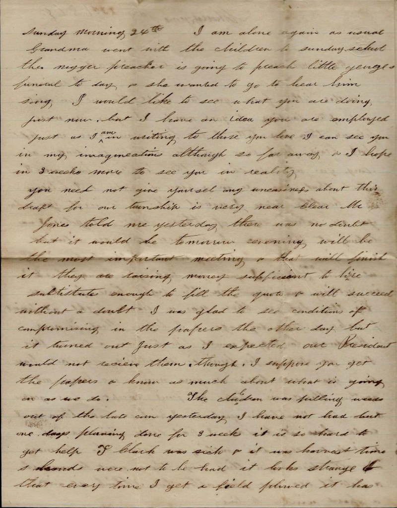 I would like to see what you are doing just now but I have an idea you are employed just as I am in writing to those you love. I can see you in my imaginations although so far away & I hope in three weeks more to see you in reality. You need not give yourself any uneasiness about this draft for our township is very near clear. Mr. Jones told me yesterday there was no doubt but it would be. Tomorrow evening will be the next important meeting & that will finish it. They are raising money sufficient to hire substitutes enough to fill the quota & will succeed without a doubt.