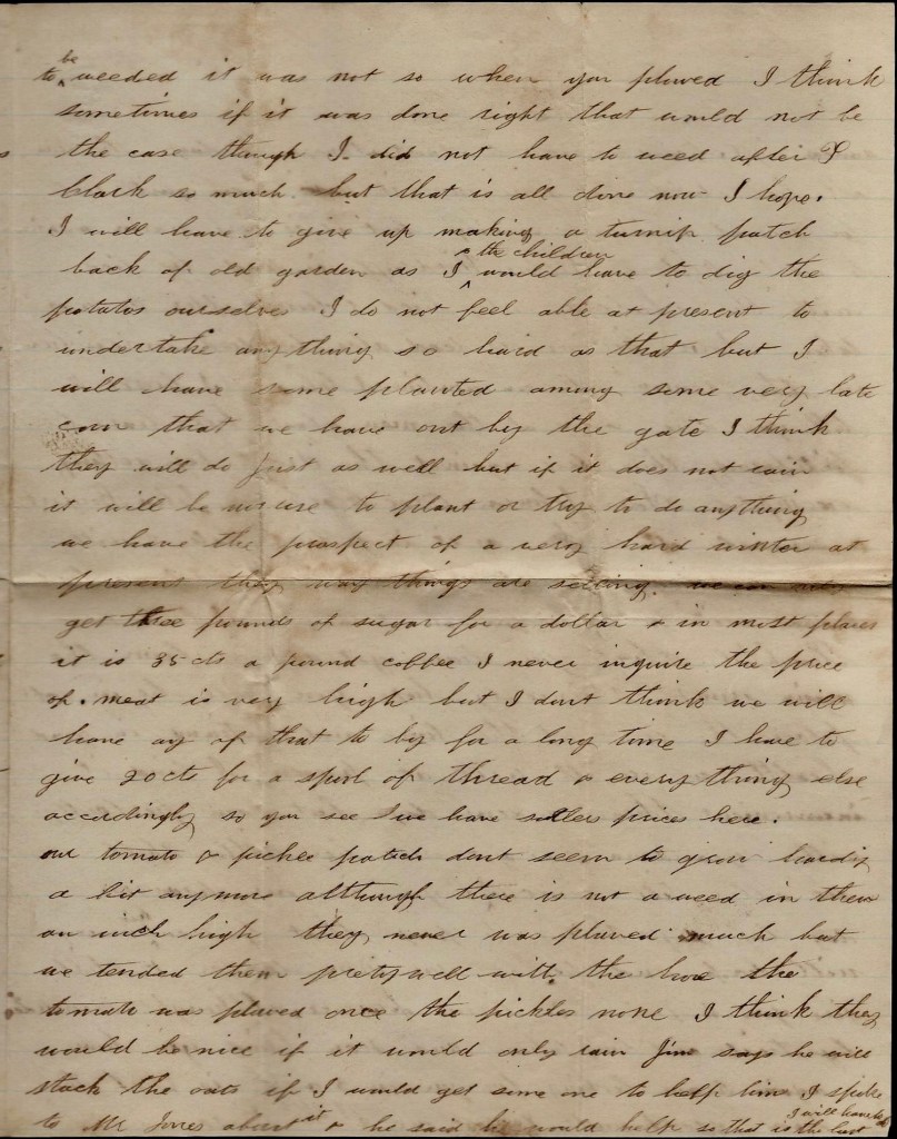 The children was pulling weeds out of the late corn yesterday. I have not had but one days plowing done for three weeks, it is so hard to get help. T. Clack was sick & it was harvest time & hands were not to be had. It looks strange that every time I get a field plowed, it has to be weeded. It was not so when you plowed. I think sometimes if it was done right, that would not be the case though I did not have to weed after T. Clack so much. But that is all done now, I hope. I will have to give up making a turnip patch back of old garden as I and the children have to dig the potatoes ourselves. I do not feel blessed at present to undertake anything so hard as that but I will have some planted among some very late corn that we have out by the gate. I think they will do just as well. But if it does not rain, it will be no use to plant or try to do anything.