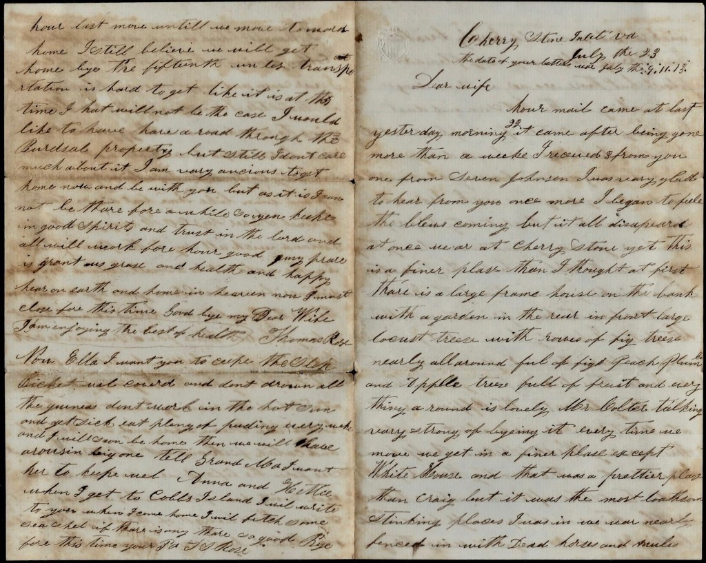 Now Ella, I want you to keep the stock [ ] covered and don’t drown all the guineas. Don’t work in the hot sun and get sick. Eat plenty of pudding every week and I will soon be home. Then we will have a rousing big one. Tell Grandma I want her to keep well. Anna and Hettie, when I get to Cobb’s Island, I will write to you. When I come home I will fetch some sea crabs if there is any there. So goodbye for this time. Your Pa, — T. S. Rose