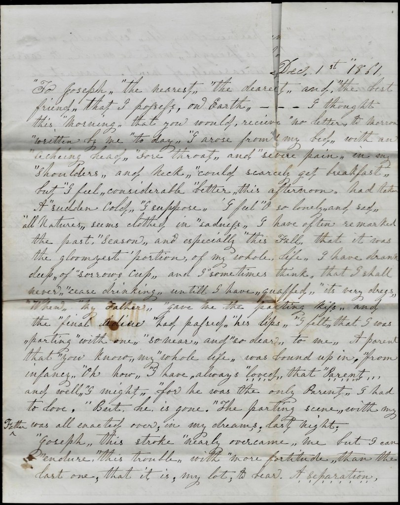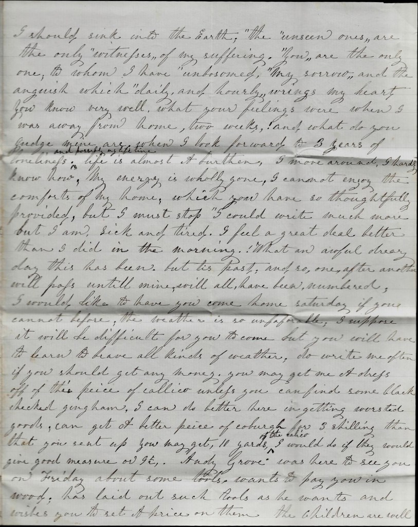 I thought this morning that you would receive no letters tomorrow written by me today. I arose from my bed with an aching head, sore throat, and severe pain in my shoulders and neck, could scarcely get breakfast but I feel considerably better this afternoon. Had taken a sudden sold I suppose. I feel Oh so lonely and sad. All nature seemed clothed in sadness. I have often remarked the past season, and especially this fall, that it was the gloomiest portion of my whole life. I have drank deep of sorrow’s cup and I sometimes think that I shall never cease drinking until I have quaffed its very dregs.