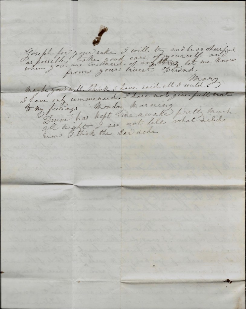 Joseph, for your sake, I will try and be as cheerful as possible. Take good care of yourself and when you are in need of anything, let me know. From your truest friend, — Mary