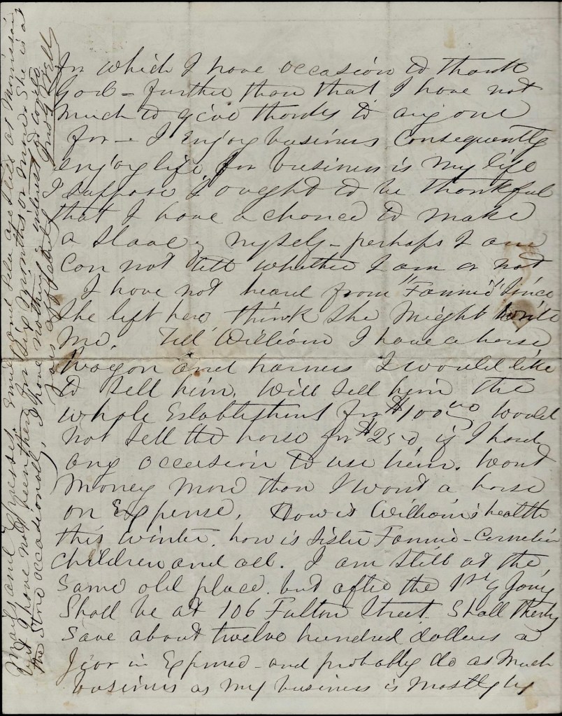 I have not heard from “Fannie” since she left here. Think she might write me. Tell William I have a horse, wagon & harness I would like to sell him. Will sell him the whole establishment for $100. Would not sell the horse for $250 if I had any occasion to use him. Want money more than I want a horse on expenses.