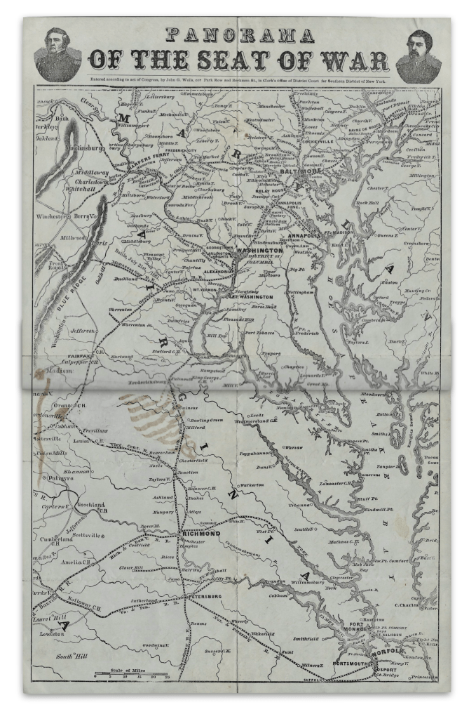 Wells’ letter was written on patriotic stationery that included this large “Panorama of the Seat of War” map printed on the inside of the folded sheet.Note that under the title it reads, “Entered according to act of Congress by John G. Wells, corner of Park Row and Beekman Street, in Clerk’s Office of District Court for Southern District of New York.”This same map was marketed by Wells in 1861 as a stand-alone folding map measuring 15″ x 9 ” although instead of portraits of Winfield Scott and George McClellan in the upper corners, it was sold with images of Commodores Silas H. Stringham and Andrew Hull Foote. See “Early Pocket Map.”This same stationery (without a letter written on it by the designer & marketer himself) is available for purchase at Gosen Rare Books for $750.