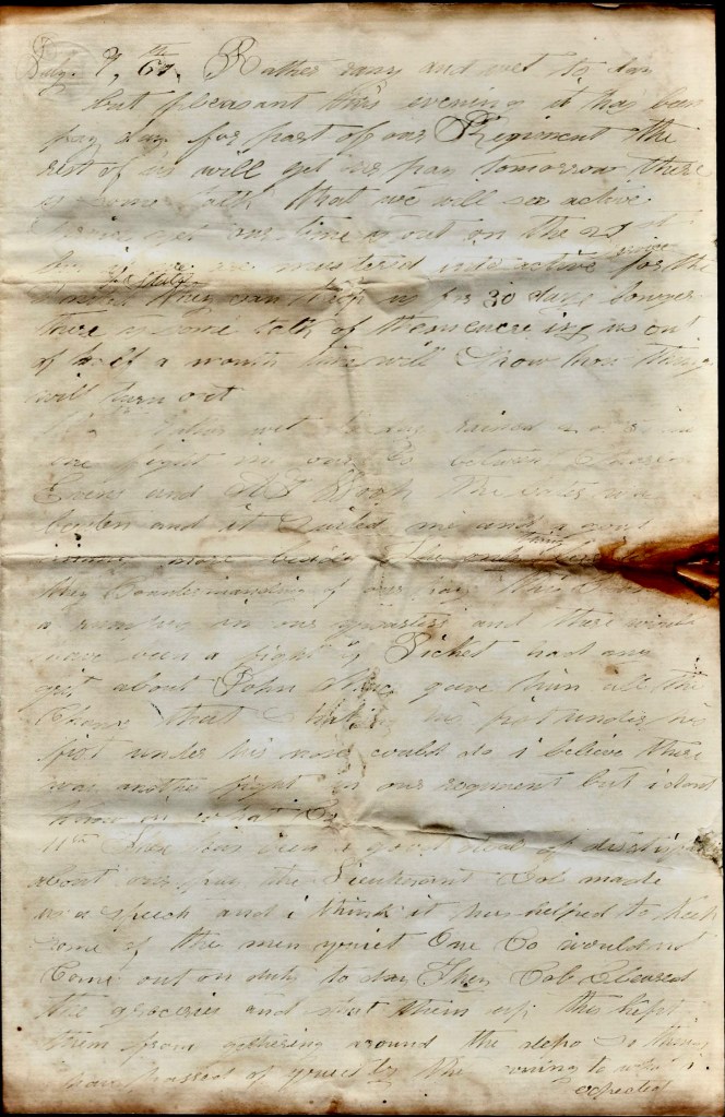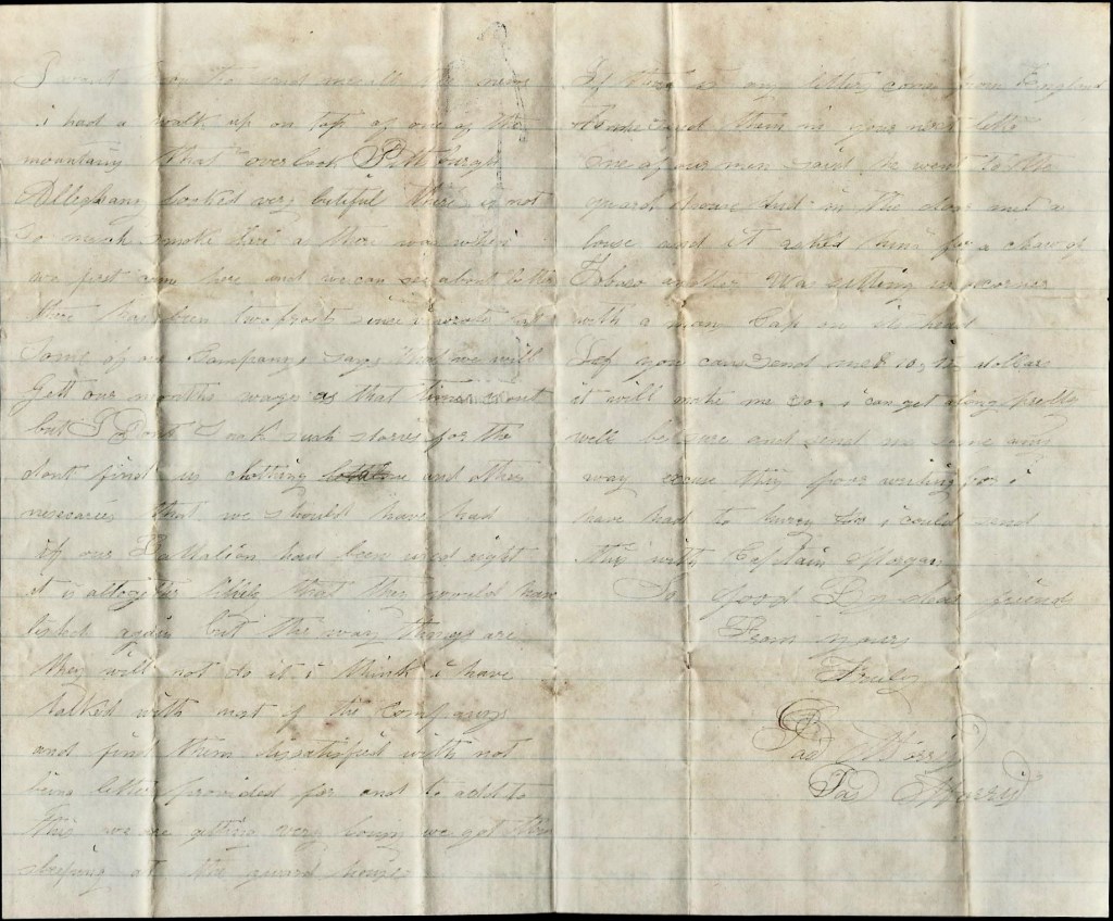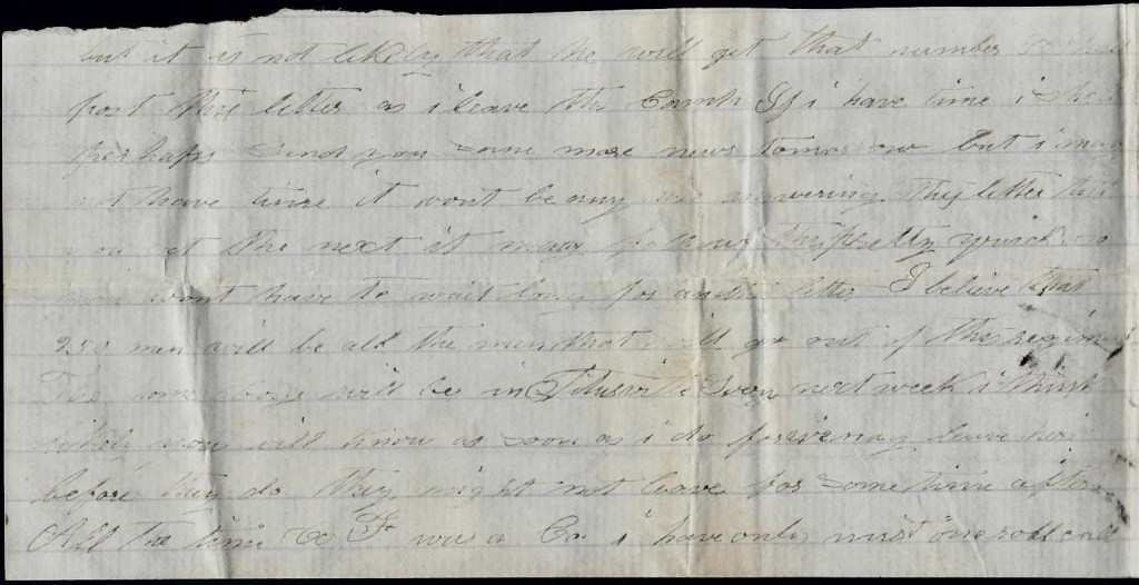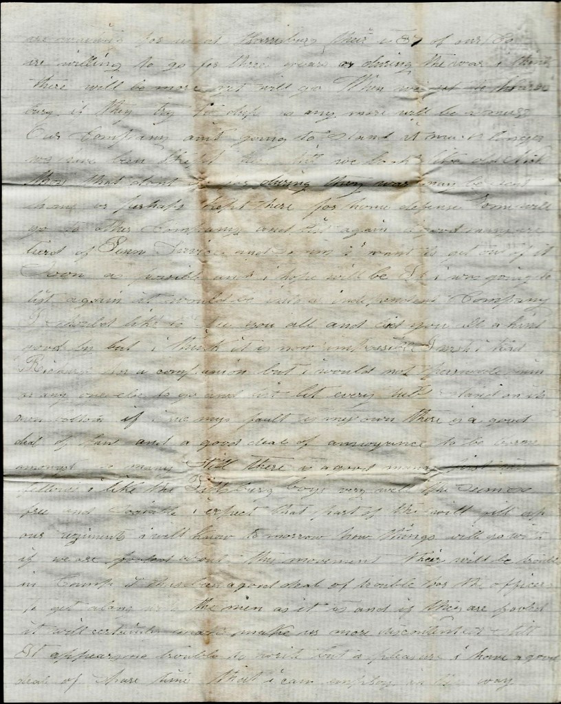We may move from here any hour. The Colonel it is said has got back. One of the officers has been to the headquarters……[illegibly faded]…..all that will go for three years have to be ready tomorrow morning to go to Harrisburg. Thence to Chambersburg. Our arms and equipment are waiting for us at Harrisburg. There is 87 of our company willing to go for three years and during the war. I think there will be more yet that will go. When we get to Harrisburg, if they try to [ ] us anymore will be a mess. Our Company ain’t going to stand it much longer. We have been kept here til we look like old Nick. Those that don’t go for during the war may be sent home or perhaps kept there for home defense. Some will go to other companies and enlist again. A good many are tired of Penn Service and so am I. I want to get out of it soon as possible and I hope will be. If I was going to enlist again, it would be into an independent company.