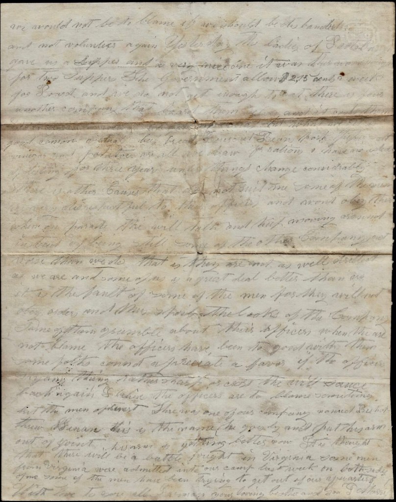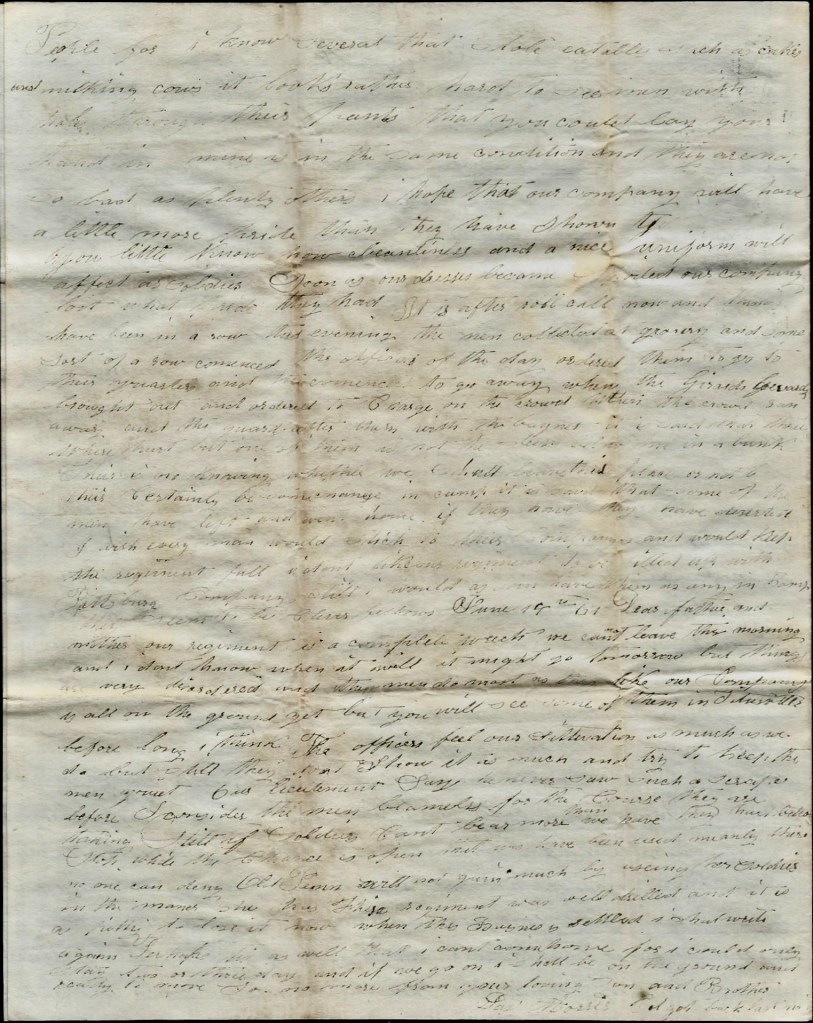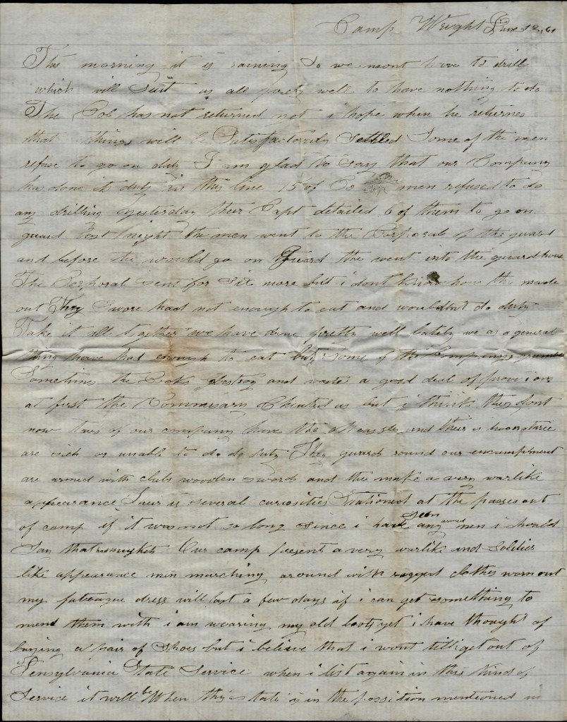 This morning it is raining so we won’t have to drill which will suit us all pretty well to have nothing to do. The Colonel has not returned yet. I hope when he returns that things will be satisfactorily settled. Some of the men refuse to go on duty/ I am glad to say that our company has done its duty in this line. Fifteen of Co. [ ‘s] men refused to do any drilling yesterday. Their captain detailed six ofthem to go on guard last night. The men went to the Corporal of the Guard and before they would go on guard, they went into the guard house. The corporal sent for six more but I don’t know how they made out. They swore they had not enough to eat and wouldn’t do duty. Take it all together, we have done pretty well lately. We, as a general thing, have had enough to eat but some of the companies grumble. Sometimes the cook destroys and wastes a good deal of provisions. At first the commissary cheated us but I think they don’t now.