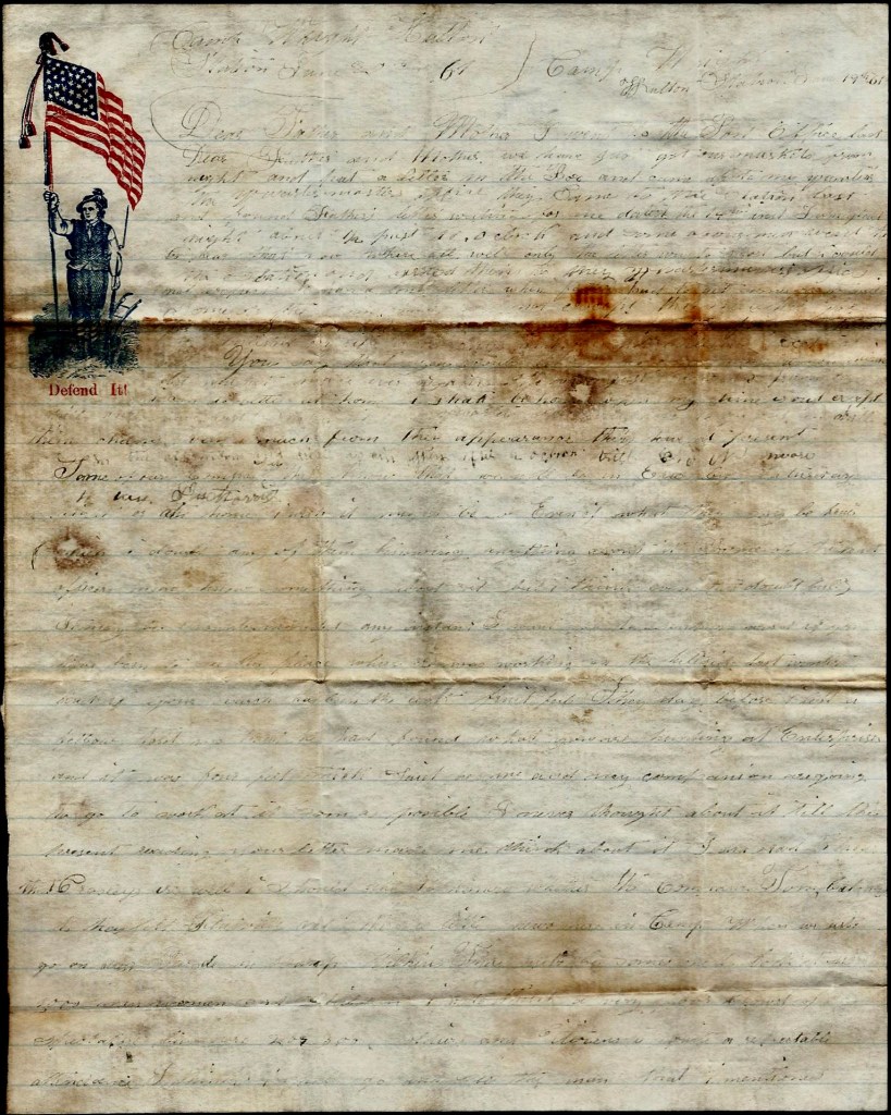 Dear Eleanor, since I last wrote, the curse of treason and rebellion has ben broken out in our beautiful land and we have to draw the sword or bow down and be slaves to our Southern Brethren. Rather than they should trample our flag in the dust, is it not better to meet the ruffianly crew on their own soil and hold our honor good and keep one of the best flags waving that has ever been the emblem of nationality. All the North asks of the South is for them to lay down their arms, swear allegiance and go peacefully to their homes and respect the flag they have tried to dishonor and send their representatives and Congressmen as they did before the rebellion. Nothing short of this will satisfy all Union loving men.