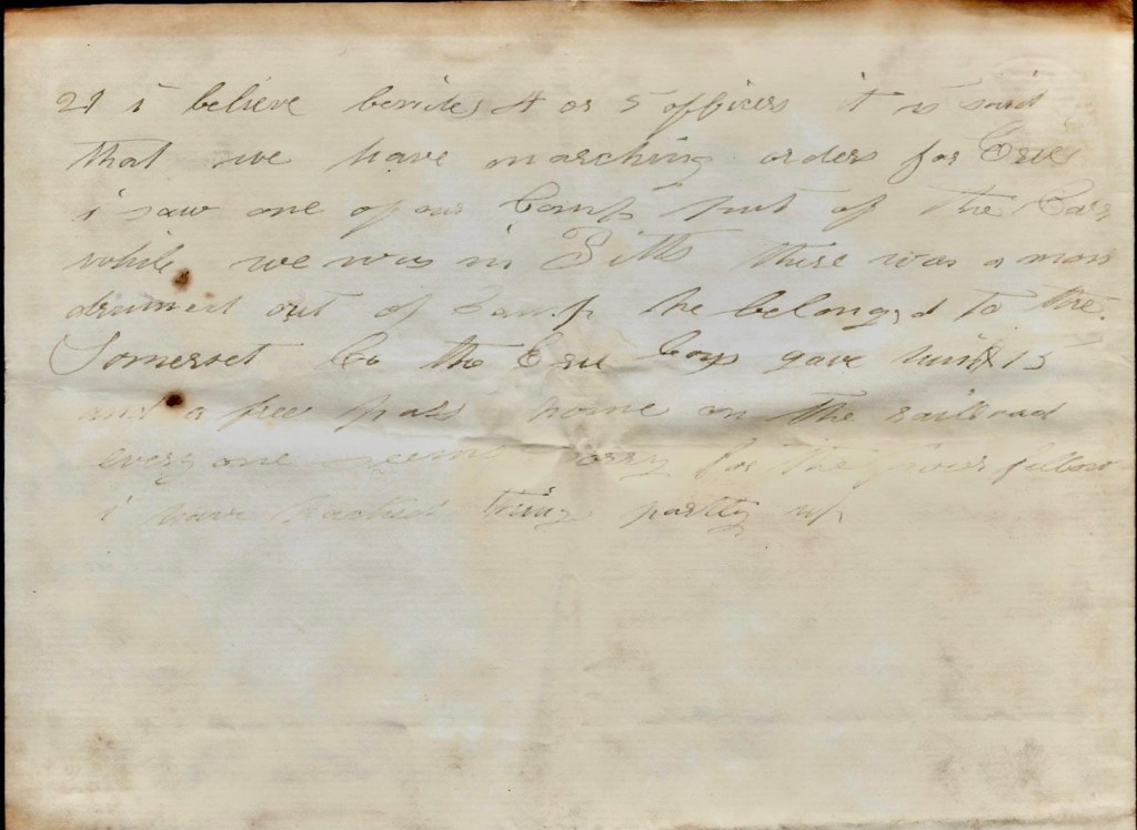 From Baltimore here the country looks desolate. No fences and about 150 miles from here it was soldiers all along the track guarding…[rest of letter is missing]