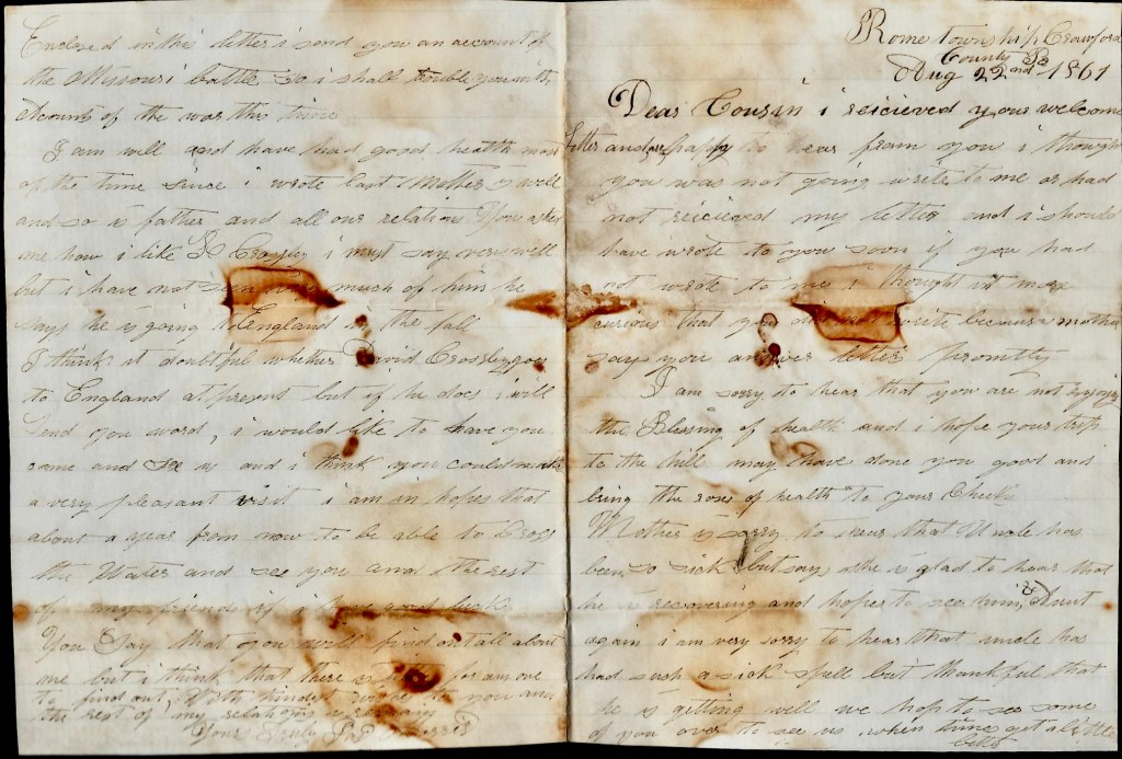 The following letters were written by James Morris (1837-1863), the son of British emigrants Richard Morris (1810-1871) and Jane Harrison (1806-1887). Richard and Jane both emigrated separately, met and married each other in Patterson, New Jersey in 1830. Jane had been in the United States four years working in the textile mills as a weaver. After marriage the couple lived in New York City for a time and in 1837 moved to the English settlement in Rome township, Crawford county, Pennsylvania, where Richard took up farming. It was here in Crawford county, in October 1837, that James was born. At the time of the 1860 US Census, James was enumerated in his parents household as a 23 year-old “farm laborer.” He had at least four younger brothers and one younger sister. An older brother, Edward (1831-1912), born in New York, was married to Ellen Harrison (1836-1906) in 1854 and living on his own in Rome township.