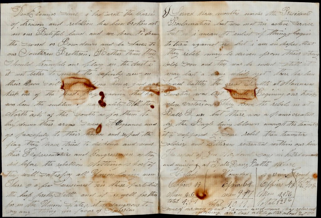 There has been several battles. The great Battle at Manassas Junction was lost. In the beginning our troops were victorious. They drove the rebels in at Bulls Run, but there was a panic created by the bugle being blown amongst the teamsters—it is supposed by some rebel. Then teamsters, soldiers and citizens retreated within our lines. The report of Gen. McDowell says in killed, wounded and missing at Bulls Run Battle were 481 killed, 1011 wounded, and 1216 missing, or a total of 2,708. Some of our men went home and some has returned making our loss all together about 2,000.