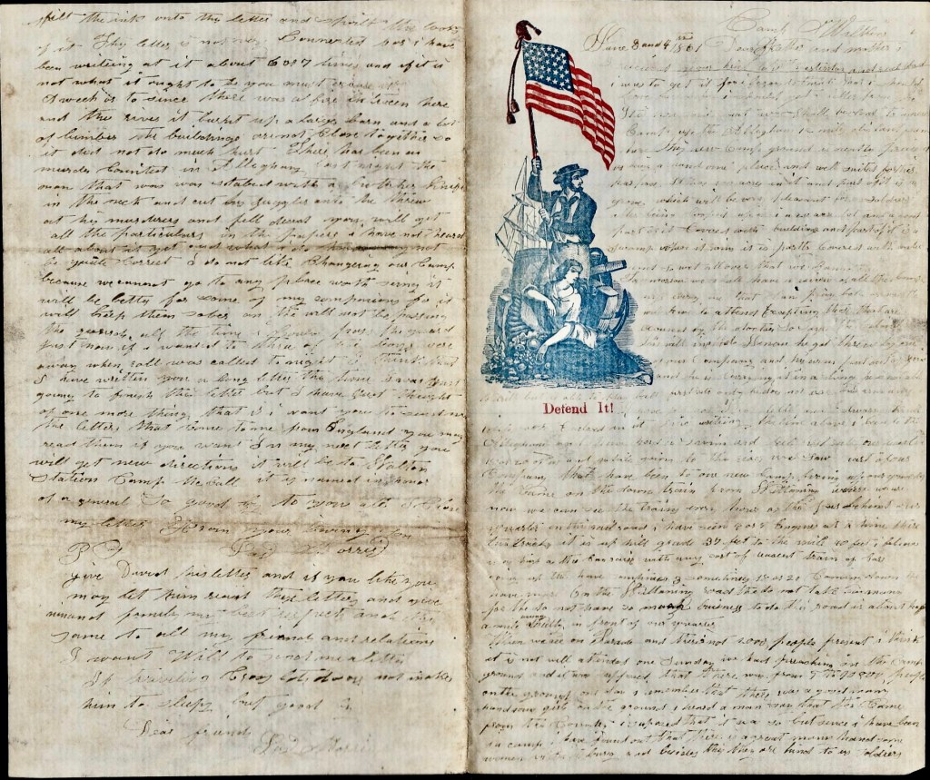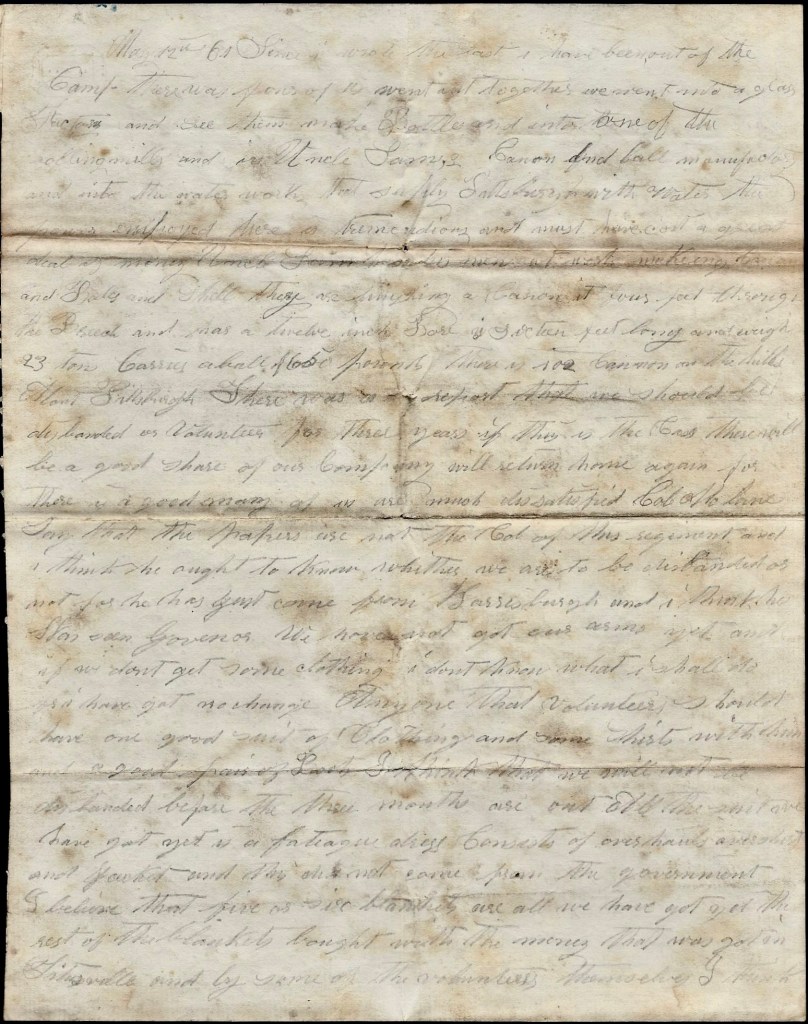 We have not got our arms yet and if we don’t get some clothing, I don’t know what I shall do as I have got no change. Anyone that volunteers should have one good suit of clothing and some shirts with him and a good pair of boots. I think that we will not be disbanded before the three months are out. All the suit we have got yet is a fatigue dress [which] consists of our pants and shirt and jacket and they did not come from the government. I believe that five or six blankets are all we have got. The rest of the blankets [were] bought with the money that was got in Titusville and by some of the volunteers themselves. I think we would not be to blame if we should be disbanded and not volunteer again.