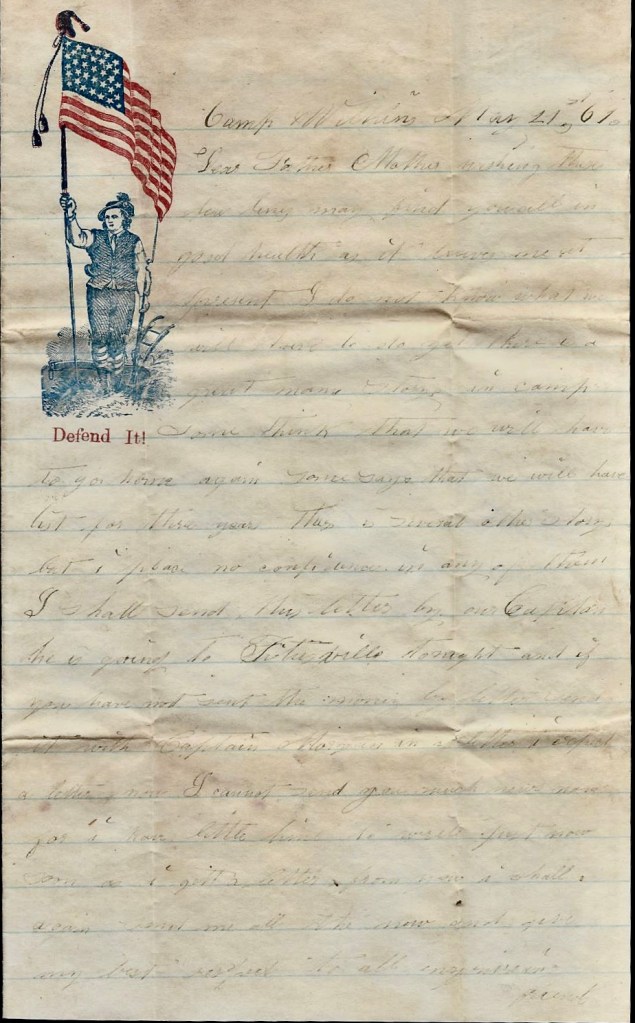 Wishing these few lines may find you all in good health as it leaves me at present. I do not know what we will have to do yet. There is a great many stories in camp. Some think that we will have to go home again. Some says that we will have to enlist for three years. There is several other stories but I place no confidence in any of them. I shall send this letter by our captain. He is going to Titusville tonight and if you have not sent the money by letter, send it with Captain Morgan in a letter. I expect a letter now. I cannot send you much news now for I have little time to write just now. Soon as I get a letter from you, I shall write again. Send me the [money] now and give my best respects to all enquiring friends. I want you to send me all the news.