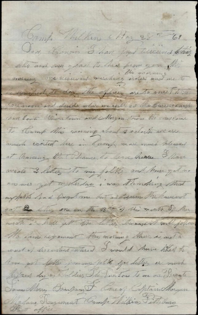 The directions to me are Private James Morris, Company F, Care of Captain Morgan, McLane’s Regiment, Camp Wilkins, Pittsburgh Post Office