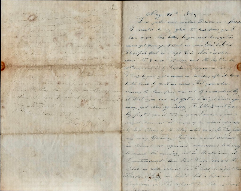 I have just received this letter and am glad to hear from you this morning. We received marching orders this morning and are to be equipped today. The officers are to meet this forenoon and decide where we will go. The secesh have taken Uniontown and Morgantown. The news came to camp this morning about 2 o’clock. We are much excited here in camp. We are much pleased at having the chance to leave here.