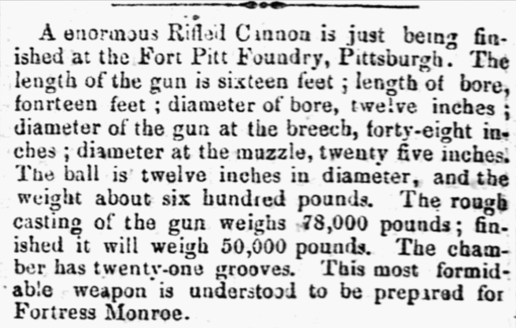 They are finishing a cannon—it was four feet through the breech and has a twelve inch bore, is sixteen feet long and weighs 23 tons. It carries a ball of 650 pounds. There is 102 cannon on the hills about Pittsburgh.