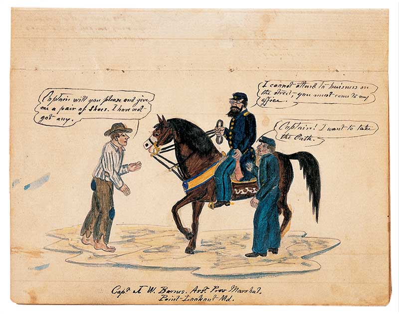 Confederate POW’s laughing at a USCT soldier who accidentally killed his fellow sentry at Point Lookout, Maryland. This scene was one of many sketches made by Confederate POW Jack Omenhausser.