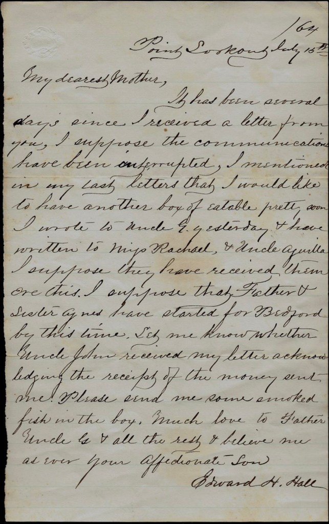 It has been several days since I received a letter from you. I suppose the communications have been interrupted. I mentioned in my last letters that I would like to have another box of eatables pretty soon. I wrote to Uncle George yesterday and have written to Miss Rachel, & Uncle Aquilla. I suppose they have received them ere this. I suppose that Father & Sister Agnes have started for Bedford by this time. Let me know whether Uncle John received my letter acknowledging the receipt of the money send me. Please send me some smoked fish in the box. Much love to Father, Uncle G., and all the rest & believe me as ever your affectionate son, — Edward H. Hall