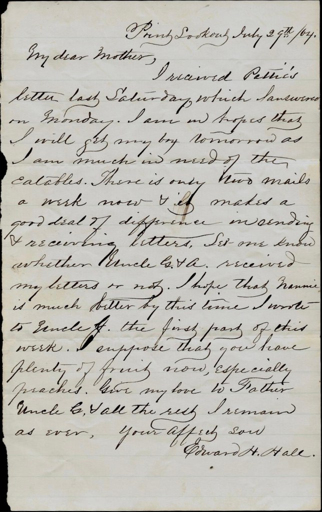 I received Pattie’s letter last Saturday which I answered on Monday. I am in hopes that I will get my box tomorrow as I am much in need of the eatables. There is only two mails a week now & it makes a good deal of difference in sending and receiving letters. Let me know whether Uncle G. & A. received my letters or not. I hope that Nannie is much better by this time. I wrote to Uncle J. the first part of this week. I suppose that you have plenty of fruit now—especially peaches. Gove my love to Father, Uncle G., and all the rest. I remain as ever, your affectionate son, — Edward H. Hall