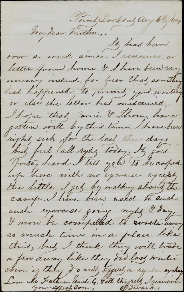 It has been over a week since I received a letter from home & I have been very uneasy indeed, for fear that something has happened to prevent your writing or else the letter has miscarried. I hope that Carrie & Thom. have gotten well by this time. I have been right sick for the last three days but feel all right today. It goes pretty hard, I tell you, to be cooped up here with no exercise except the little I get by walking about the camp. I have been used to such exercise going night and day, & now be compelled to waste away so much time in a place like this. But I think they will trade a few away like they did last winter even if they do not expect a regular exchange. Love to Father, Uncle G., and all the rest. I remain your affectionate son, — Edward