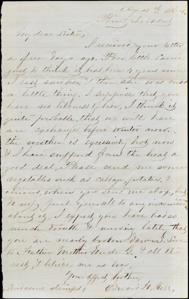 I think it quite probable that we will have an exchange before winter now. The weather is extremely hot now & I have suffered from the heat a good deal. Please send me some vegetables such as cabbage, potatoes, and onions, when you sends me a box. But do not put yourself to any inconvenience about it. I expect you have had so much trouble & nursing lately that you are nearly broken down. Love to Father, Mother, Uncle G., and all the rest, & believe me as ever your affectionate brother, — Edward H. Hall
