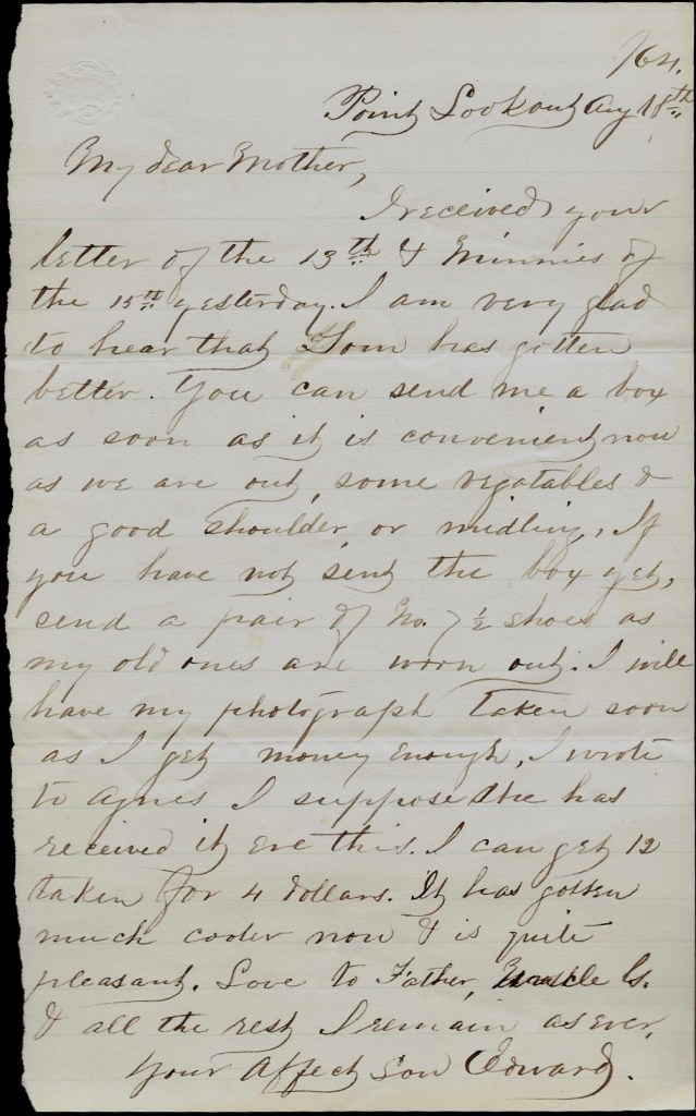 I received your letter of the 13th & Minnie’s of the 15th yesterday. I am very glad to hear that Tom has gotten better. You can send me a box as soon as it is convenient now as we are out some vegetables & a good shoulder, or middling. If you have not sent the box yet, send a pair of No 7.5 shoes as my old ones are worn out. I will have my photograph taken soon as I get money enough. I wrote o Agnes. I suppose she has received it ere this. I can get 12 taken for 4 dollars. It has gotten much cooler now & it is quite pleasant. Love to Father, Uncle G., and all the rest. I remain as ever your affectionate son, — Edward
