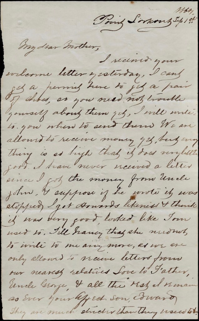 I received your welcome letter yesterday. I can’t get a permit here to get a pair of shoes, so you need not trouble yourself about them yet. I will write to you when to send them. We are allowed to receive money yet, but everything is so high that it does very little good. I have never received a letter since I got the money from Uncle John & suppose if he wrote it, was stopped. I got Howard’s likeness & think it was very good. Looked like Tom used to. Tell Nancy that she need not to write to me anymore as we are only allowed to receive letters from our nearest relatives. Love to Father, Uncle George, & all the rest. I remain as ever your affectionate son, — Edward