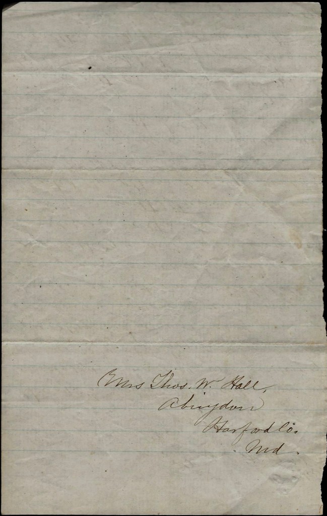 I received your welcome letter with five dollars enclosed as well as Uncle George’s yesterday. I hope that you may be able to get a permit to come & see me. I would love above all things to be at home to attend to things for you, & feel that my services are required there, but I could not desert the Holy cause in which I am engaged. The time passes very slowly in here indeed. Please give my love to Mr. Brand & thank him for the bible sent me last winter. I received the gold sent me by Uncle George. All the oys from the neighborhood were well when I saw them last & there are none here that you know. Give my love to Mother, Uncle G., and all the rest, & believe me as ever your affectionate son, — Edward H. Hall