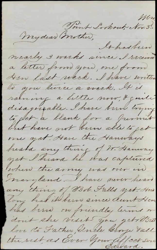 It has been 3 weeks since I received a letter from you. One from Hen last week. I have written to you twice a week. It is raining a little now & quite disagreeable. I have been trying to get a blank for a permit but have not been able to get one yet. Have the Hanways heard anything of W[illiam] Hanway yet? I heard he was captured when the army was over in Maryland. I have never heard anything of Bob Falls yet. How long has it been since Aunt Hen. has been on friendly terms or don’t she visit you yet? Best love to Father, Uncle George, & all the rest. As ever your affectionate son, — Edward
