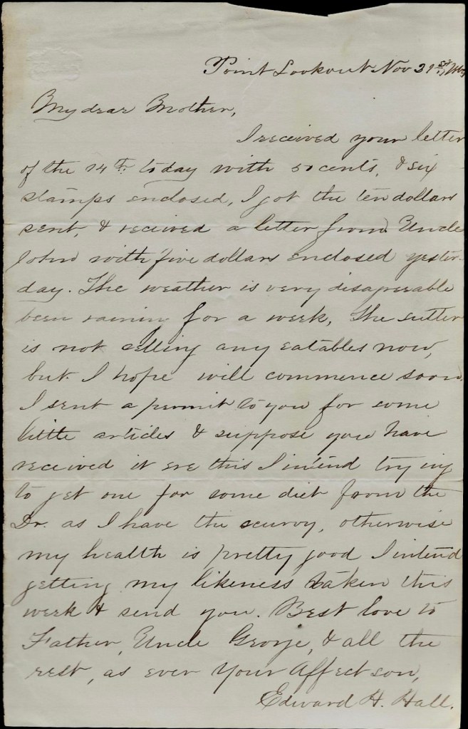 I received your letter of the 14th today with 50 cents & six stamps enclosed. I got the two dollars sent and received a letter from Uncle John with five dollars enclosed yesterday. The weather is very disagreeable. Been raining for a week. The sutler is not selling any eatables now but I hope will commence soon. I sent a permit to you for some little articles & suppose you have received it ere this. I intend trying to get one for some diet from the Dr. as I have the scurvy. Otherwise my health is pretty good. I intend getting my likeness taken this week & send you. Best love to Father, Uncle George, and all the rest. as ever your affectionate son, — Edward H. Hall