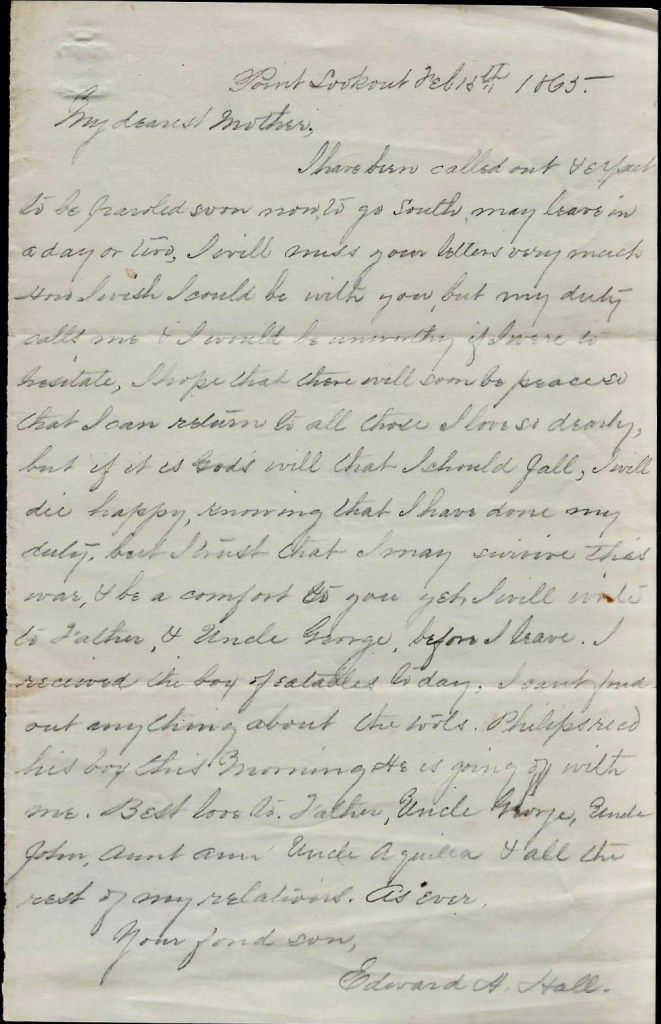 I have been called out & expect to be paroled soon now, to go South. May leave in a day or two. I will miss your letters very much. How I wish I could be with you but my duty calls me & I would be unworthy if I were to hesitate. I hope that there will soon be peace so that I can return to all those I love so dearly, but if it is God’s will that I should fall I will die happy knowing that I have done my duty, but I trust that I may survive this war, & be a comfort to you yet. I will write to Father & Uncle George before I leave. I received the box of eatables today. I can’t find out anything about the tools. Philips received his box this morning. He is going off with me. Best love to Father, Uncle George, Uncle John, Aunt Ann, Uncle Aquilla, & all the rest of my relations. As ever, your fond son, — Edward H. Hall