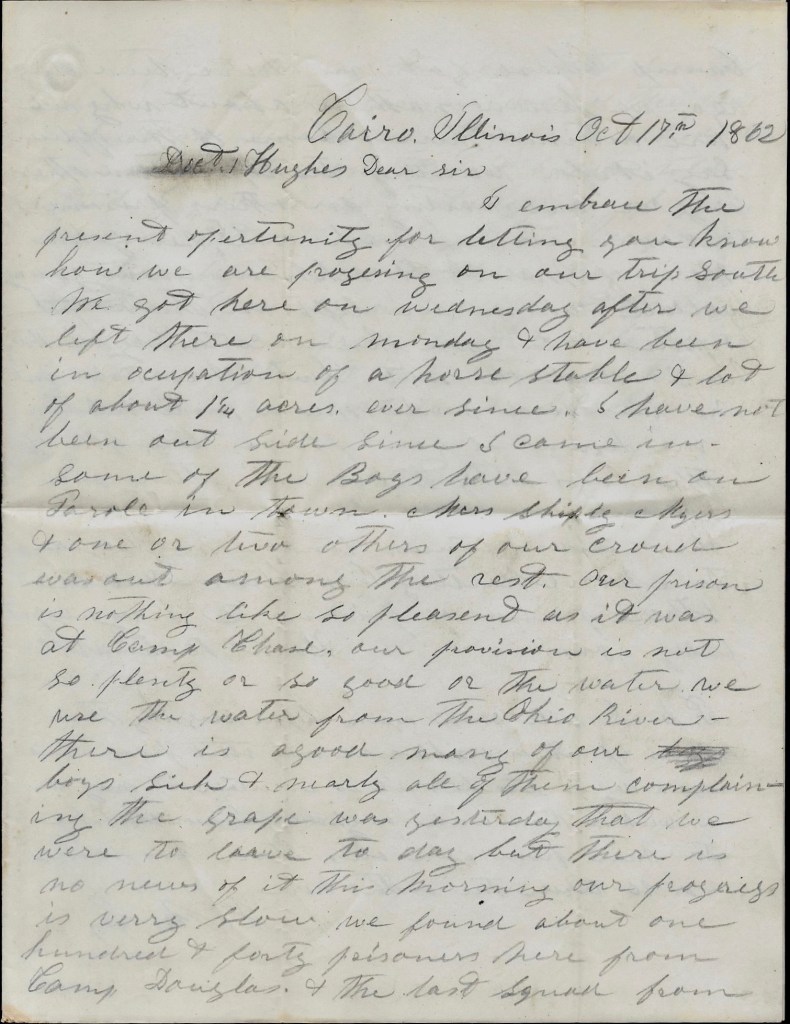 According to Samuel’s military record, he was taken prisoner on 7 September 1862 at Darksville, Virginia, and confined first in the Atheneum Military Prison in Wheeling, then at Camp Chase, and finally at Camp Douglas. He was officially exchanged at Vicksburg on 1 November 1862, some two weeks after this letter.