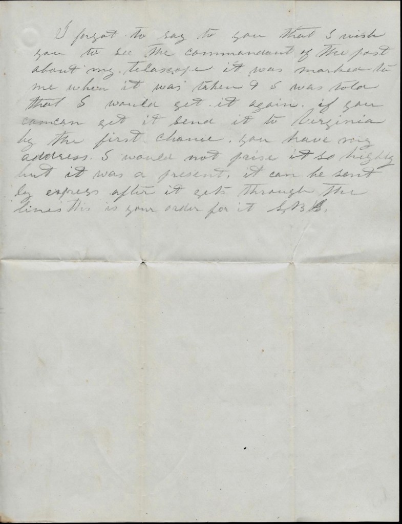I forgot to say to you that I wish you to see the commandant of the post about my telescope. It was marked to me when it was taken & I was told that I would get it again. If you can get it, send it to Virginia by the first chance. You have my address. I would not prize it so highly but it was a present. It can be sent by express after it gets through the lines. This is your order for it. — S. B. S.