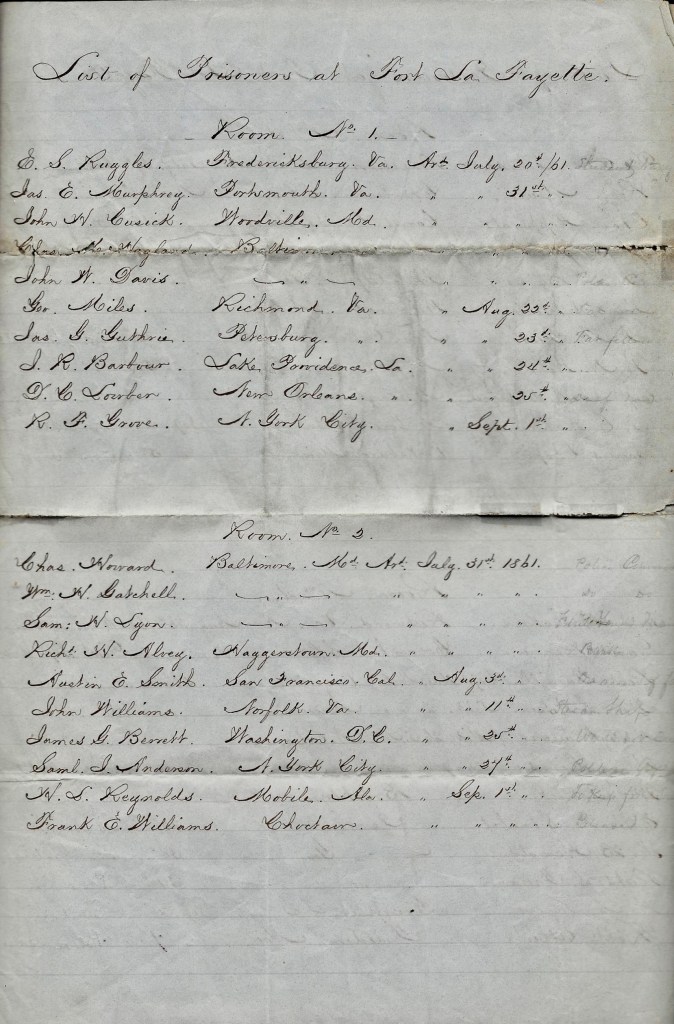 This handwritten list may have be the original document prepared by Hillary Cenas, one of the original prisoners, and given to David Reno who was recently discharged from Fort Lafayette. See the following newspaper article appearing in the Daily Constitutionalist (August, GA) and other papers on 13 September 1861: