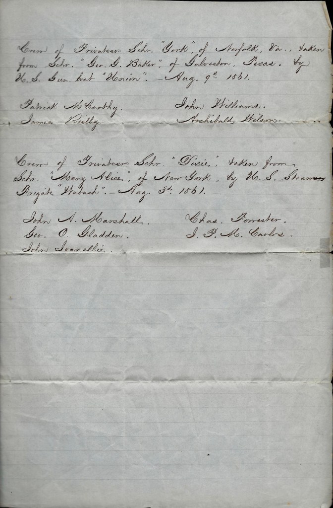 Crew of Privateer Schooner Dixie taken from Schooner Mary Alice of New York, by U. S. Steam Frigate Wabash, August 3, 1861