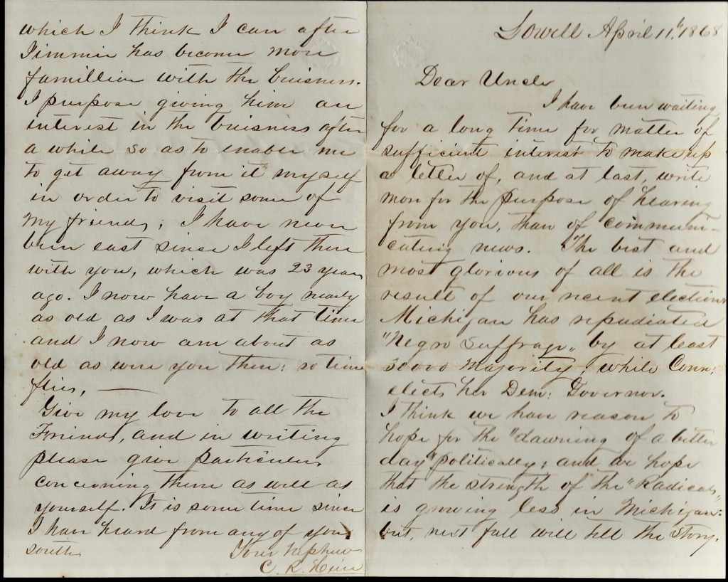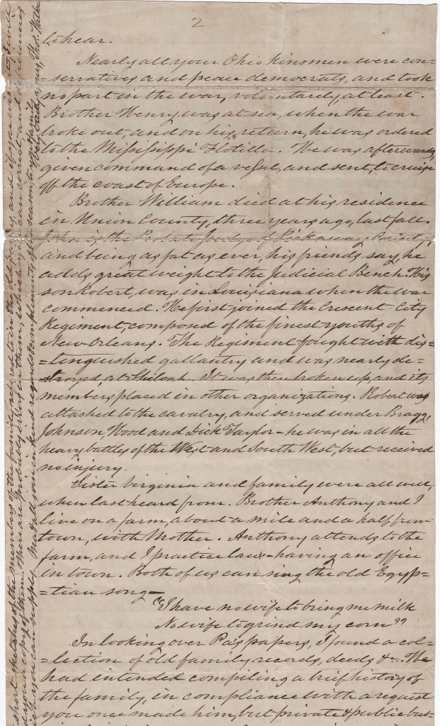 For a long time past, I have thought of writing you to ascertain the condition of our Virginia kinfolk and whether or not they suffered much during the late unnatural war, but I did not feel confident that my letter would reach you, nor do I feel altogether so now.