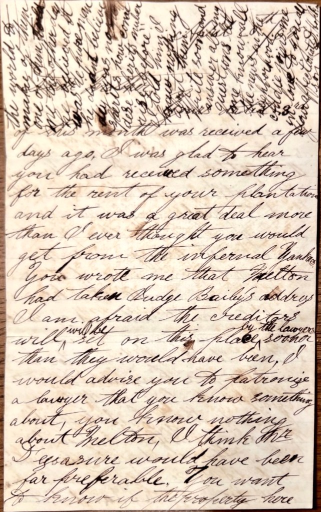 Yours dated 3rd of this month was received a few days ago. I was glad to hear you had received something for the rent of your plantation and it was a great deal more than I ever thought you would get from the infernal Yankees. You wrote me that Melton had taken Judge Bailey’s address. I am afraid the creditors will be set on this place by the lawyers sooner than they would have been. I would advise you to patronize a lawyer that you know something about. You know nothing about Melton. I think Mr. D’ysasure would have been far preferable.